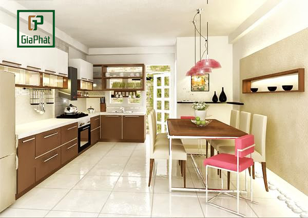 Phòng bếp nhà ống sẽ được thiết kế hình chữ L hoặc chữ U với vật dụng đa năng, hiện đại. Nội thất bếp cũng không cần quá cầu kì, chỉ cần mang lại sự thoải mái, thuận tiện cho người dùng. Bởi diện tích nhà nhỏ nên thông thường kiến trúc sư sẽ sắp xếp phòng ăn cạnh bếp để tiết kiệm không gian.